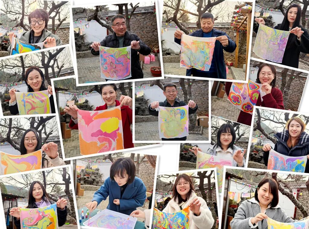 品嘗完甜蜜的糖葫蘆,大家又紛紛投入到水拓畫絲巾活動(dòng)中。創(chuàng)作、水拓、固色再到晾干,隨著一幅幅色彩斑斕的畫作拓印于絲巾之上,大家由衷地發(fā)出歡呼和贊嘆,欣賞著這份獨(dú)一無二的美,感受非物質(zhì)文化遺產(chǎn)水拓畫的獨(dú)特魅力。水拓絲巾的制作不僅考驗(yàn)著大家的耐心與細(xì)心,更是一次對美的追求與探索。